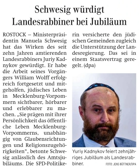 NNN, 15.09.25, S.2, Schwesig würdigt Landesrabbiner bei Jubiläum